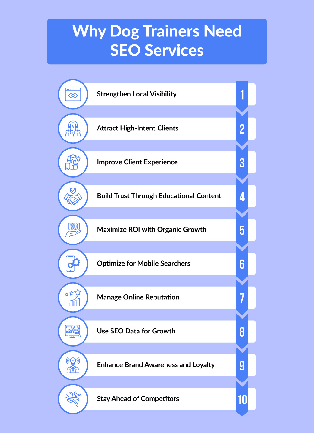 SEO helps attract more pet owners, build credibility, and increase training inquiries through higher Google rankings.