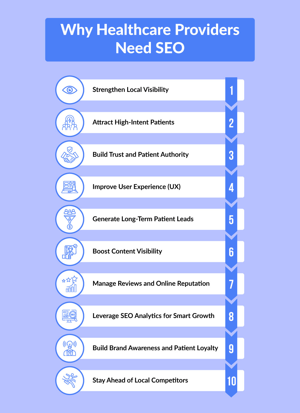 SEO allows healthcare providers to connect with patients actively searching for treatments or specialists — without relying on paid ads. It ensures your clinic appears in searches such as “cardiologist near me” or “pediatric clinic in [Area].”