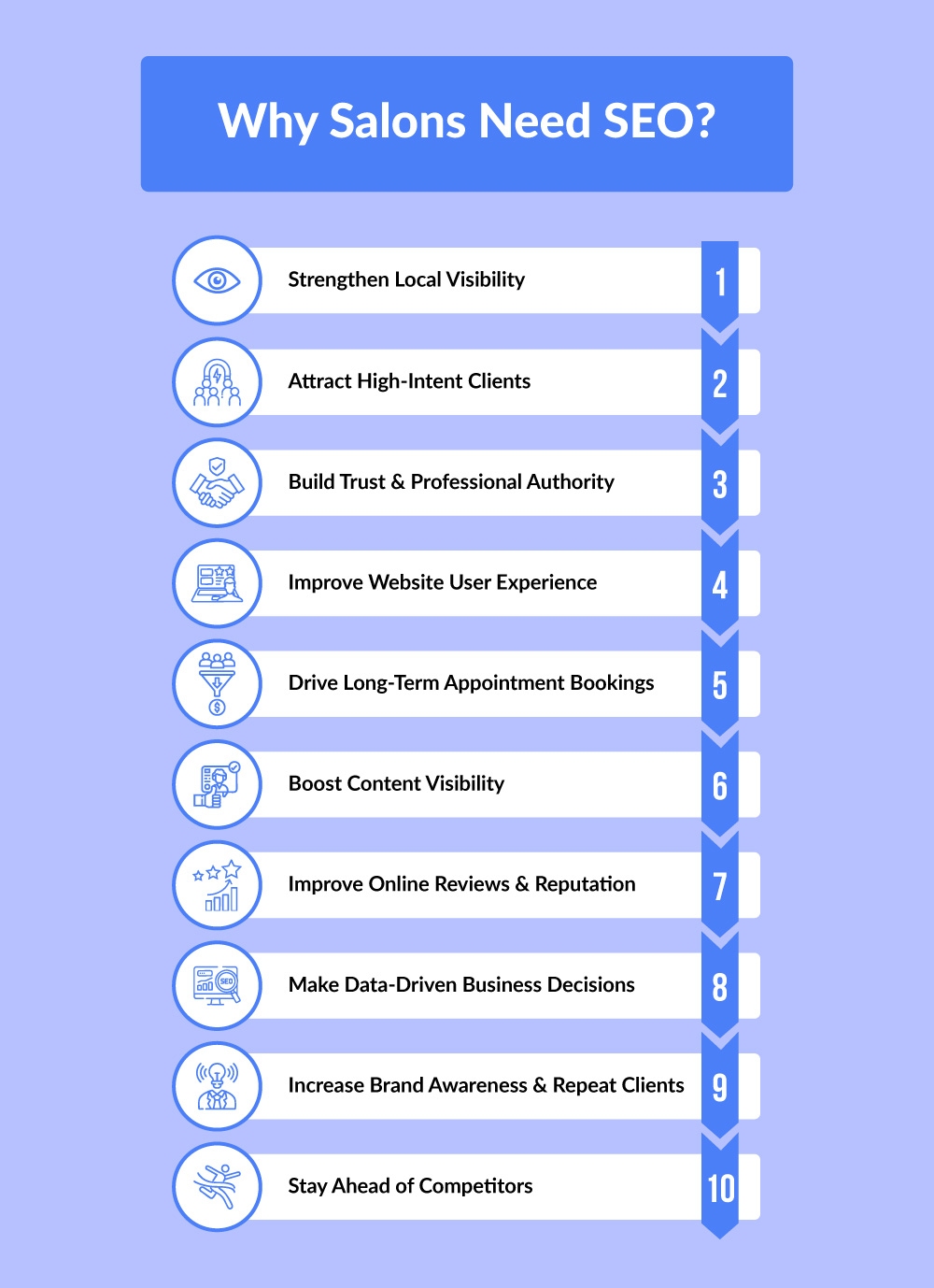- Salons with strong SEO outperform competitors by up to 55% in search visibility.